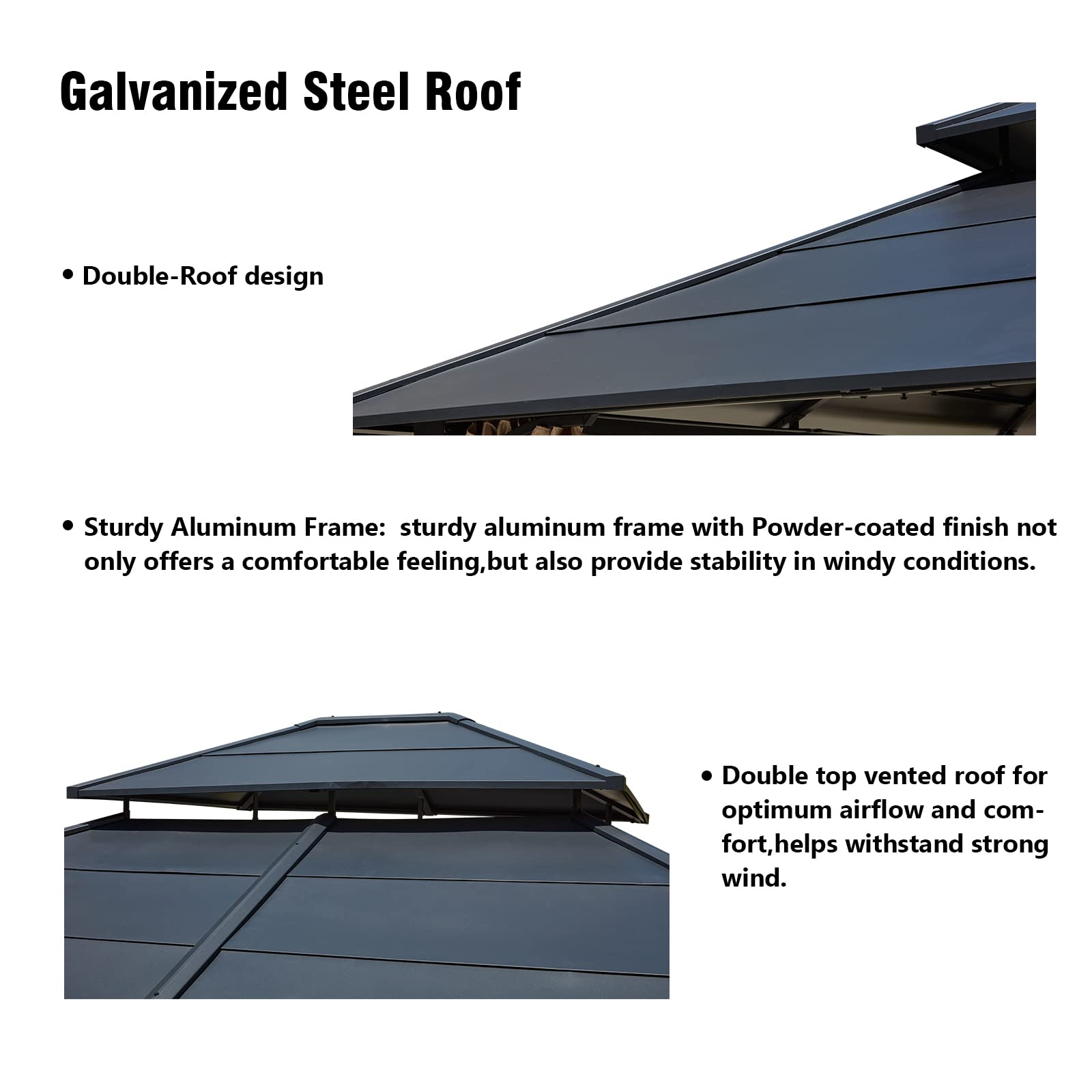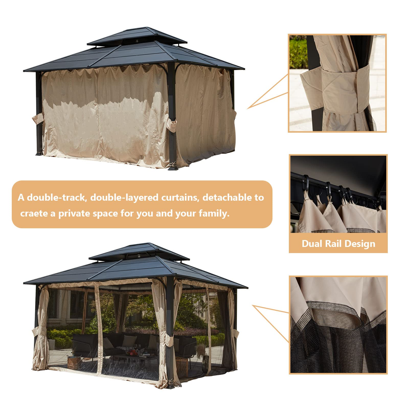 【Gazebo】12x14 Hardtop Gazebo, Iron Double Roof Gazebo with Curtains & Netting, Waterproof Canopy Gazebo