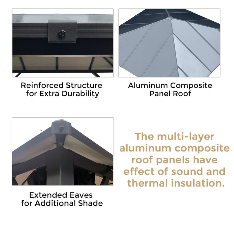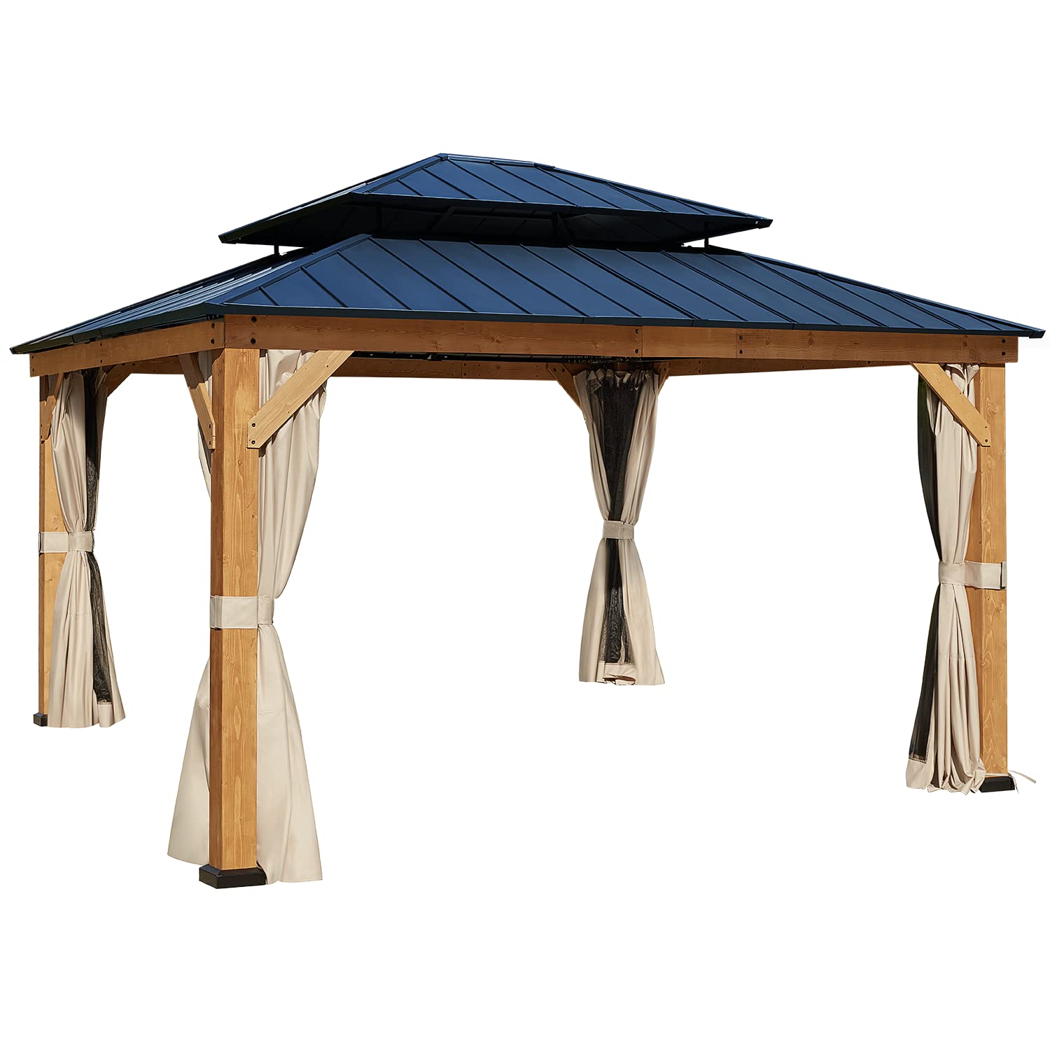 【Gazebo】11x13 Outdoor Cedar Frame Wood Gazebo with Black Steel Hardtop Roof for Patio, Garden, Backyard