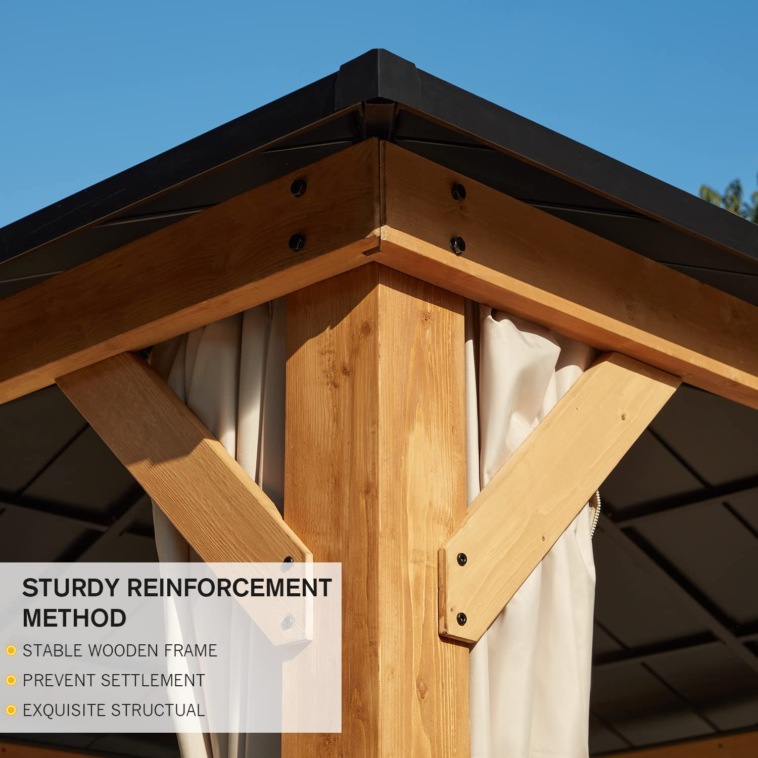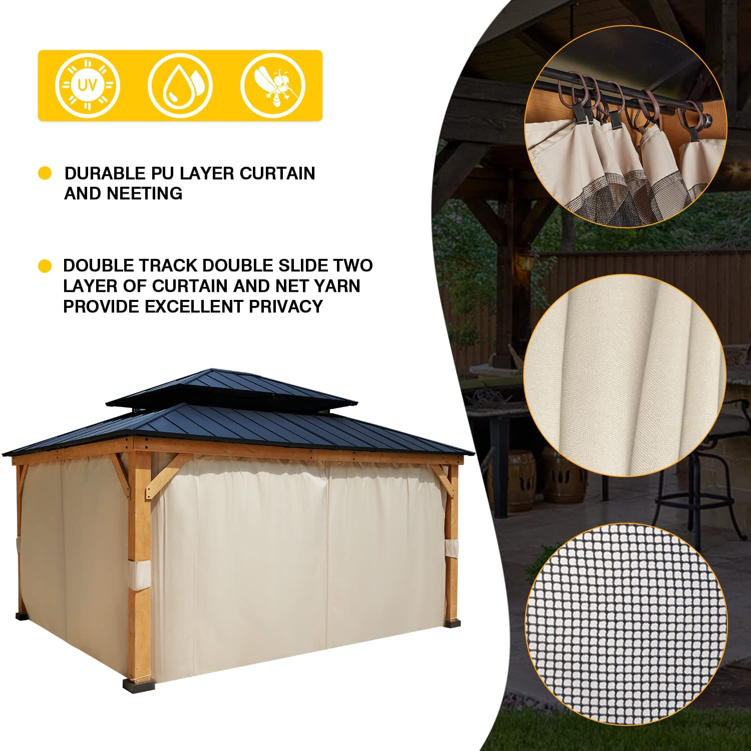 【Gazebo】11x13 Spruce Wood Gazebo, Outdoor Hardtop Gazebo with Privacy Curtains & Mosquito Netting