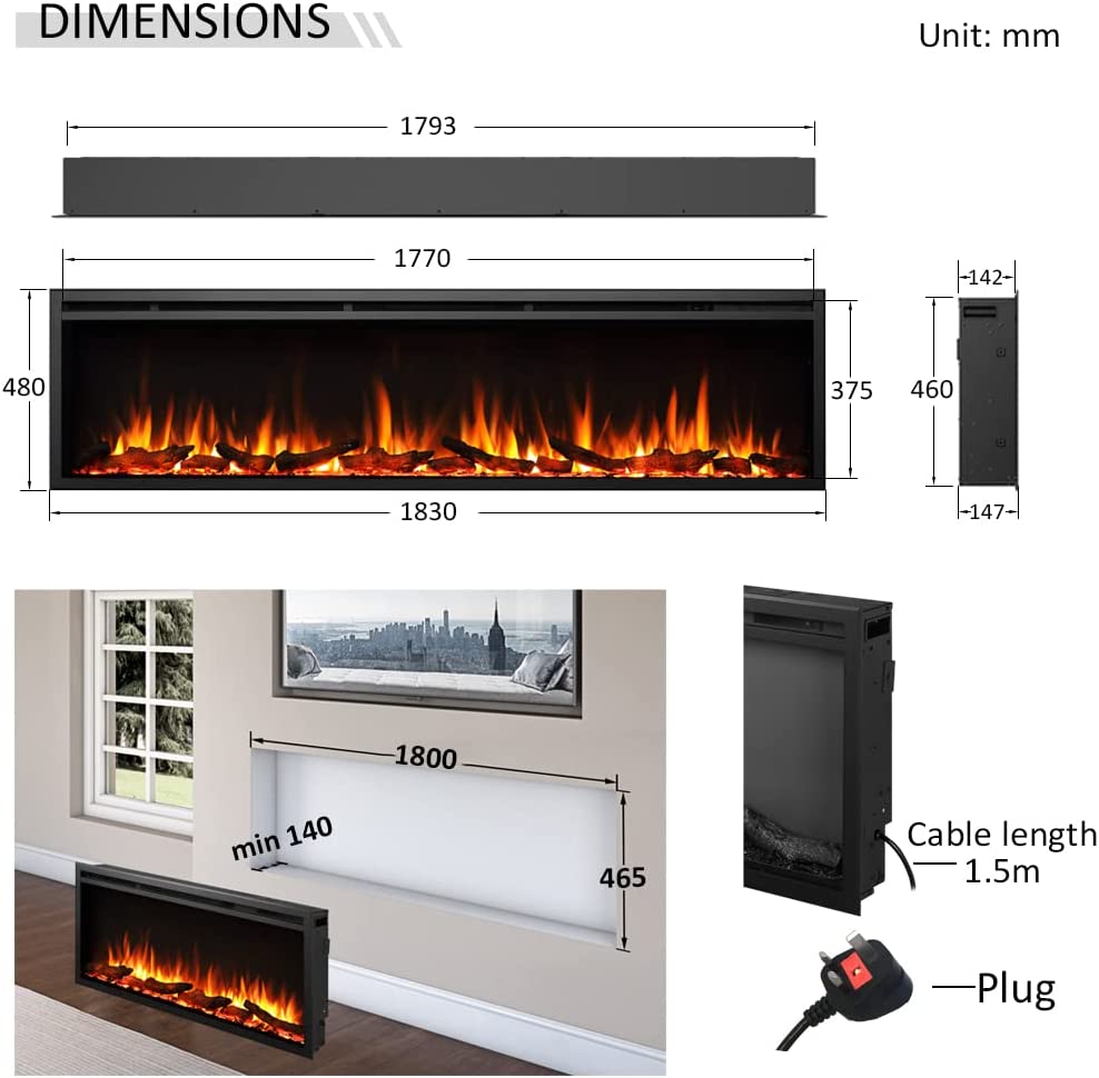 【Home Improvement】 72"/183cm Castello Slim Frame Recessed Media Wall Inset Electric Fireplace with Multi Flame Colours 750W/1500W
