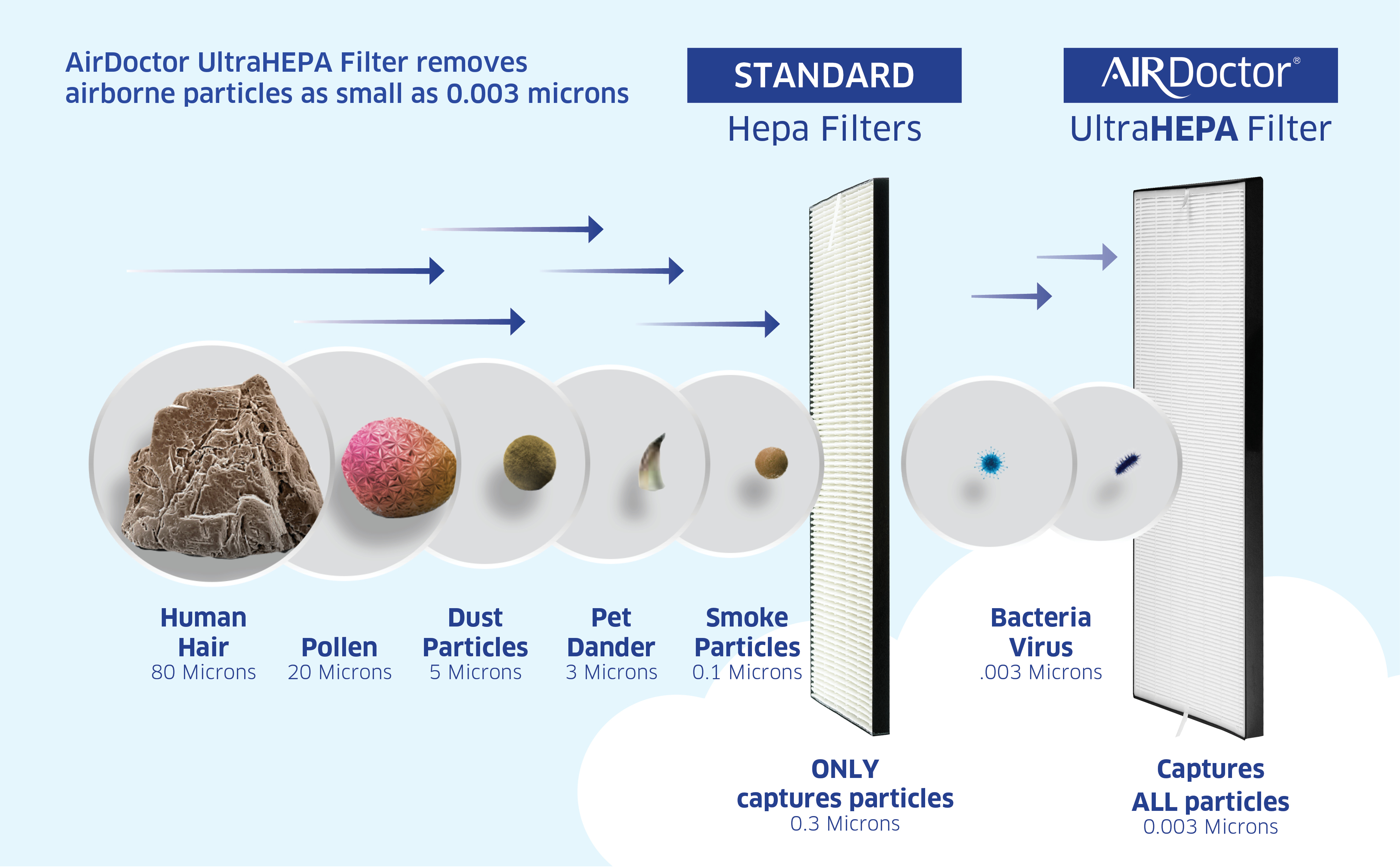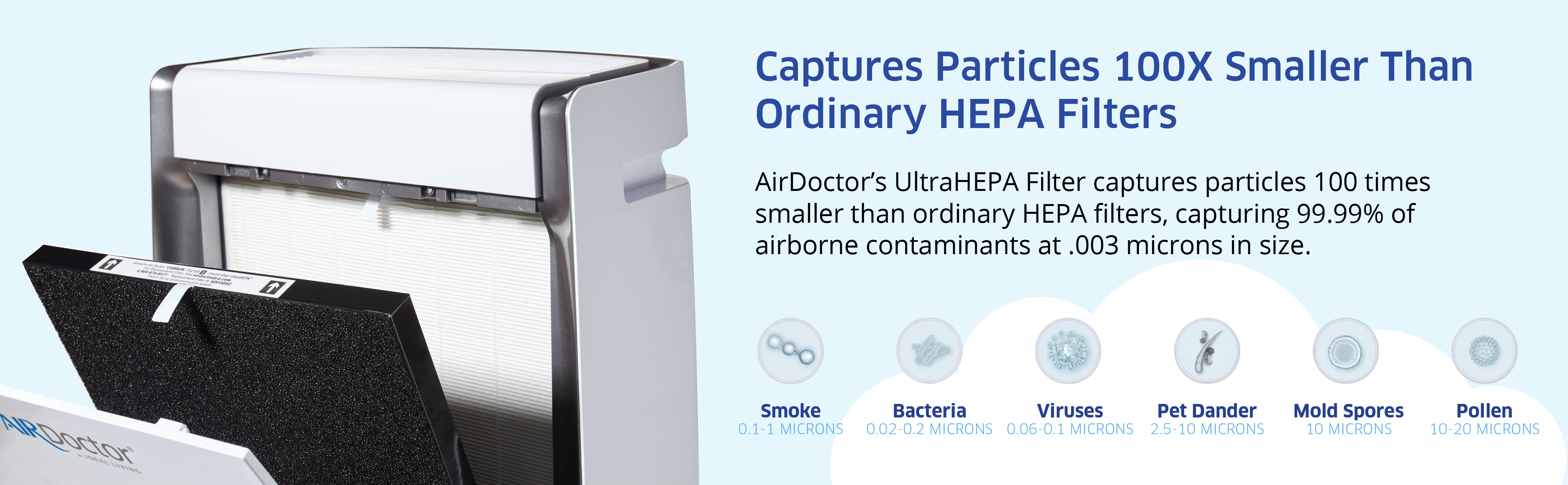 • REMOVES PARTICLES 100Xs SMALLER THAN HEPA STANDARD – Our UltraHEPA filter is independently tested and proven to remove airborne particles as small as 0.003 microns in size.