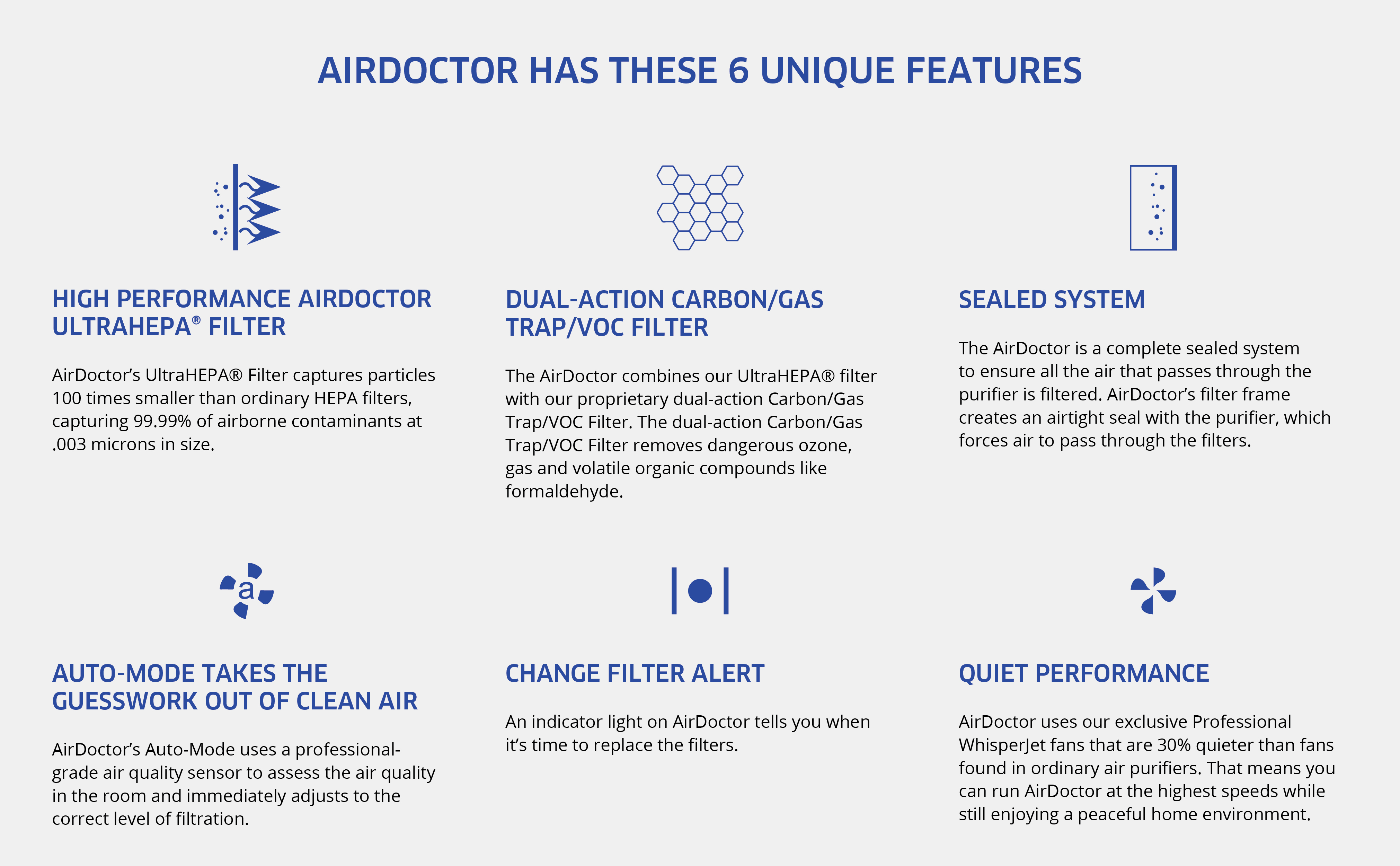 AirDoctor is the first affordable PURIFIER that not only removes virtually 100% of airborne particles, but also the vast majority of toxic ozone, volatile organic compounds and gases.