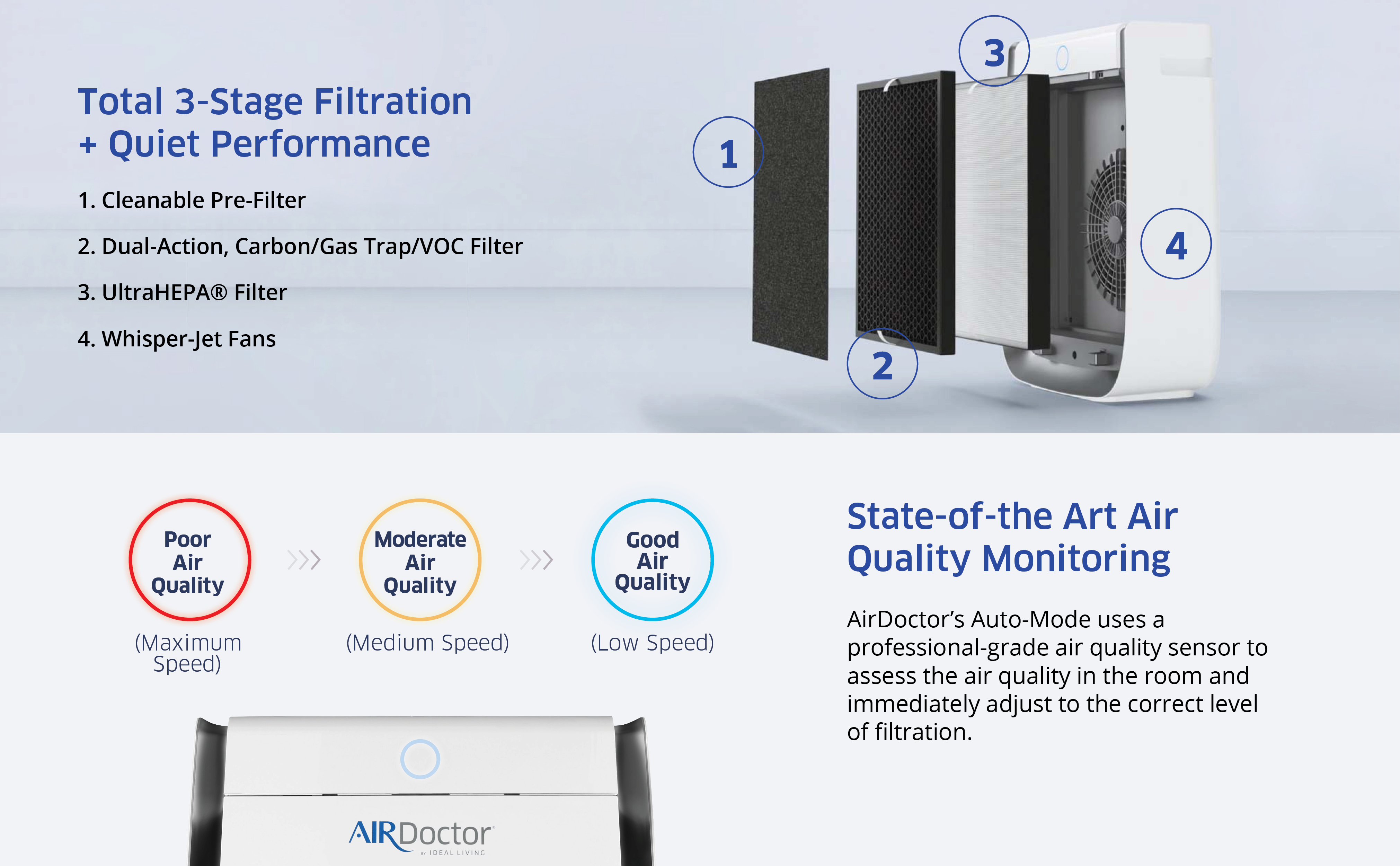 • HIGH PERFORMANCE: 3-stage filtration provides another layer of protection to the air you breathe. With its UltraHEPA filter and proprietary dual-action Carbon VOC (Volatile Organic Compounds) filter, the AirDoctor 3000 air filter removes allergens, dog dander, and other volatile organic chemicals like formaldehyde.