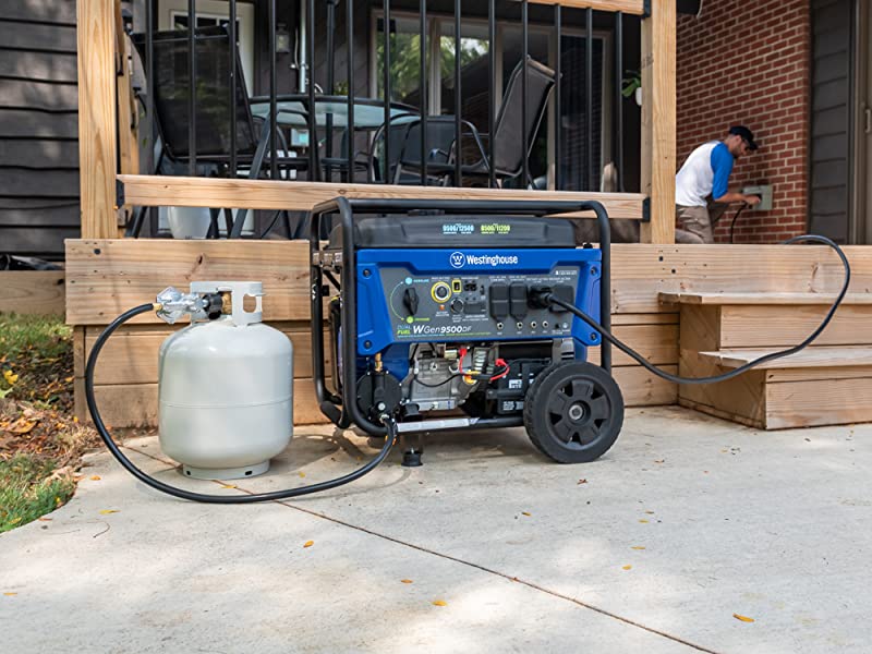 Brand Westinghouse Outdoor Power Equipment Wattage 12500 watts Fuel Type electric Power Source Gas Powered Recommended Uses For Product Residential Voltage 120 Volts Output Wattage 12500 Watts Special Feature Electric Start, Overload Protection, Automatic Voltage Regulation, Low Oil Shutdown, Muffler, Hour Meter, Dual Fuel, Fuel Gauge, Remote Start Included Components Oil Bottle, Oil Funnel, Spark Plug Wrench, Remote, Propane Regulator/Hose, Battery Float Charger Color - CARB Compliant Product Dimensions 27.2"L x 26.1"W x 26.5"H Model Name Dual Fuel Portable Generator 9500 Rated and 12500 Peak Watts Engine Type 4 Stroke Ignition System Type Electronic Tank Volume 6.6 Gallons Engine Displacement 457 Cubic Centimeters Runtime 12 hours Total Power Outlets 6 Frequency 60 Hz Manufacturer Westinghouse Part Number 09503 Item Weight 199.6 pounds Country of Origin China Item model number WGen9500DF Size WGen9500DF Style 12500W Dual Fuel Pattern Generator Horsepower 16.76 Item Package Quantity 1 Special Features Electric Start, Overload Protection, Automatic Voltage Regulation, Low Oil Shutdown, Muffler, Hour Meter, Dual Fuel, Fuel Gauge, Remote Start Batteries Included? No Batteries Required? No Warranty Description 3 Year Limited What's in the box