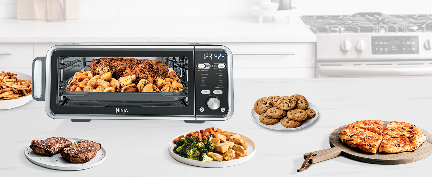 The Ninja Foodi Dual Heat Air Fry Oven gives you versatility in the kitchen with 13-in-1 functionality from Air Fry and Sear Crisp to Dehydrate and Reheat. With Dual Heat Technology, unlock up to 500°F cyclonic air and a directly heated SearPlate, which allow for fast cooking and restaurant-worthy results. Cook up your favorites and then flip the oven up and away to reclaim your counter space.