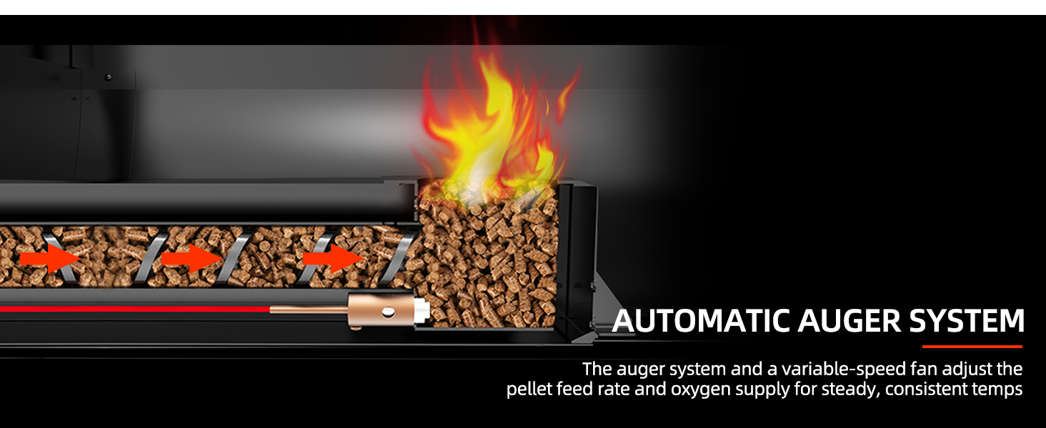 SMART TEMPERATURE CONTROL - Automated electric feed system maintains temperature from 180ºF to 450ºF, Smart Digital Controller keeps temps within +/- 20 degrees F and makes setting the grill temperature as easy as turning a dial