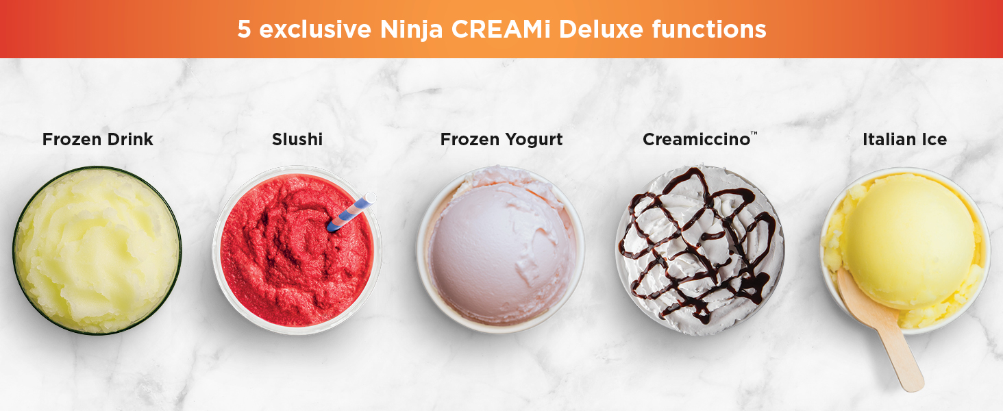 - NEW FUNCTIONALITY: Make brand new CREAMi scoopable and drinkable treats with the addition of the Slushi, Italian Ice, Frozen Drink, Creamiccino, and Frozen Yogurt functions.