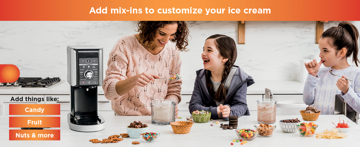 - MIX-INS: Customize your flavor and texture by mixing in your favorite chocolate, nuts, candy, fruit, and more to personalize any CREAMi treat.