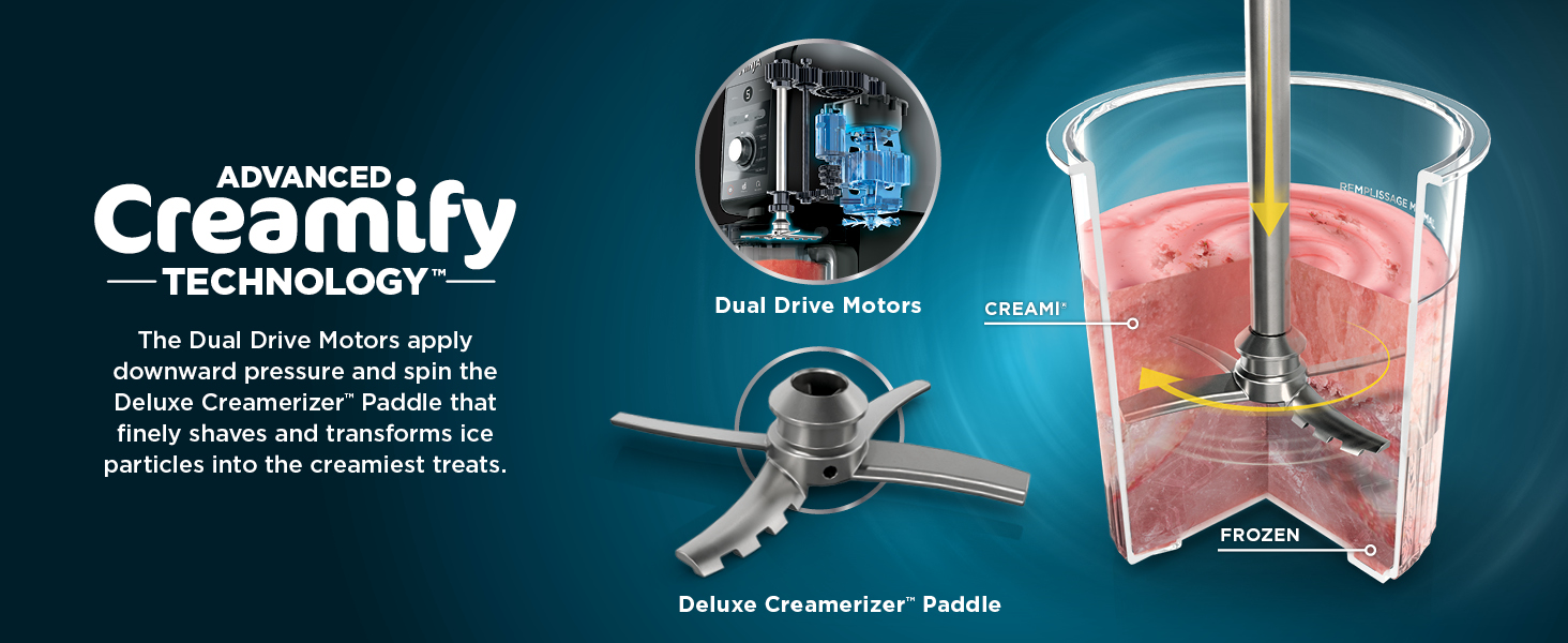 - ADVANCED CREAMIFY TECHNOLOGY: The Dual-Drive Motors apply downward pressure and spin the Professional Creamerizer Paddle that finely shaves and transforms ice particles into delicious treats like slushies, Italian ice, frozen drinks, Creamiccinos, and more.