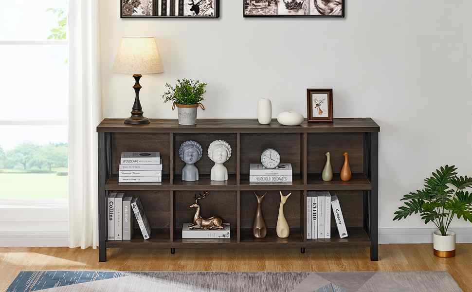 【Furniture】8 Cube Storage Organizer Bookshelf, Rustic Wood Cubby Bookcase, Industrial Horizontal Long Shelf