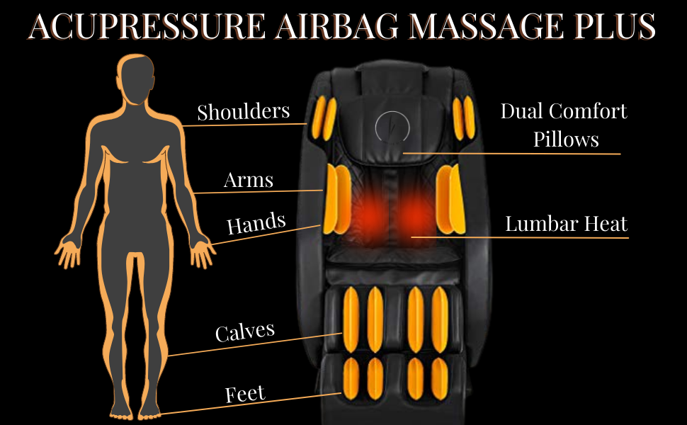 • Acupressure Airbag Massage for the Calves, Feet, Hands, Arms, and Shoulders.