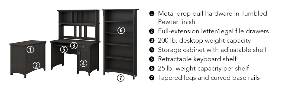 Feel comfortable in your home office with the casual styling of the Bush Furniture salinas collection. The versatile features of the Mission desk with hutch, lateral file cabinet and 5 shelf bookcase help you feel organized and keep your home looking great. Spread out on the desk surface while organizing cords in the cable management system. Store a keyboard or laptop on the pull-out shelf, and stash supplies in a box drawer and cabinet. Display photos, books and more in the open spaces of the hutch and in the 5 shelf bookcase, while you file your worries away in the 2 drawer cabinet. Attractive wood details, vertical accents, curved base rails and tapered legs create a casual look fit for a cottage, family home or apartment. Metal drop pull hardware complements the vintage black finish, which features a distressed touch to add a country feel to your space. Backed by a 1 year warranty.