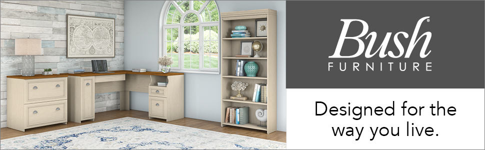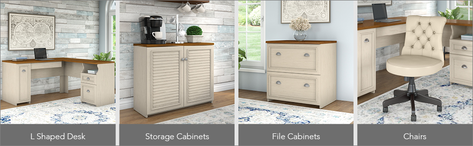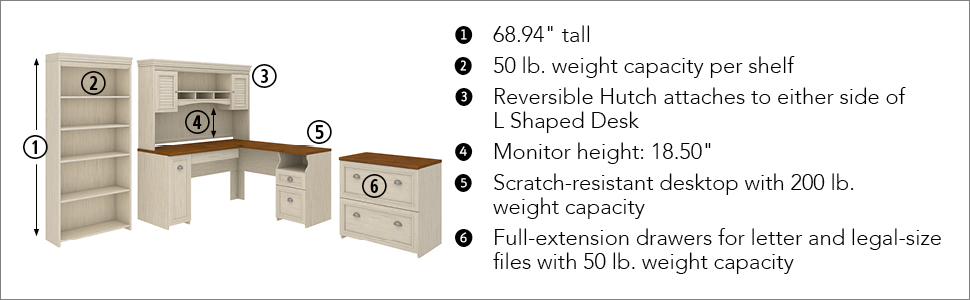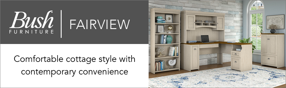 Bring a slice of modern farmhouse styling into your home office with the Bush Furniture Fairview L Shaped Desk with Hutch, Bookcase and Lateral File Cabinet. Enjoy your morning coffee, surf the net and pay bills with plenty of room to spare on the L Shaped Desk's durable surface. Stash pens, paper and checkbooks in the box drawer and open storage space, while organizing mail in the letter-size file drawer to clear the work surface. Store your laptop or keyboard in a drawer with a drop-down front, and take advantage of a large vertical closed storage area with an adjustable shelf. Charming accents, Antique Pewter hardware, framed louvered doors and attractive moldings add character to your home office. Along with two closed storage areas, the Hutch features an expansive center shelf with enough space for binders or mementos. Keep current projects nearby with three work-in-process cubby shelves, and attach the Hutch to either side of the L Shaped Desk to fit your needs. Lateral File Cabinet matches desk height to extend the work surface, and full extension file drawers glide on smooth ball bearing slides for easy access to letter, legal and A4 size files. Bookcase features three adjustable shelves to fit all of your favorite items and two fixed shelves for stability. Available in Antique Black with Hansen Cherry accents or Antique White with Tea Maple accents, Fairview meets ANSI/SOHO standards and comes with a 6 Year Warranty. See the full collection for coordinating items.