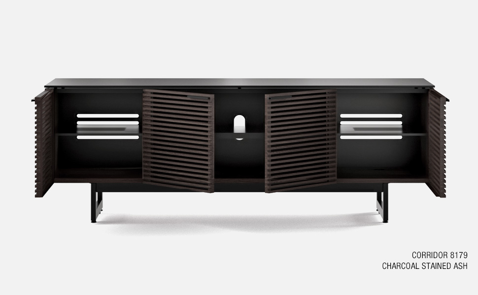 With its striking design the Corridor 8177 media console combines high functionality with premium style featuring hardwood louvered doors that keep electronics neatly concealed but always accessible This modern TV stand also includes an innovative center drawer with a full-width soundbar shelf and ample storage for discs games and other media all topped with durable satin-etched tempered glass Part of the award-winning Corridor Media Collection