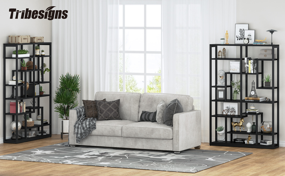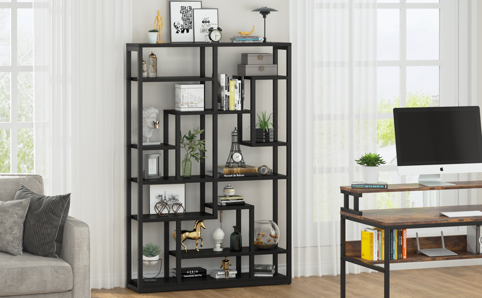 • 【Furniture】Black Bookshelf 47” Bookcase 9 Tier Tall Book Shelf Rustic Geometric Bookcase Display Shelf Organizer