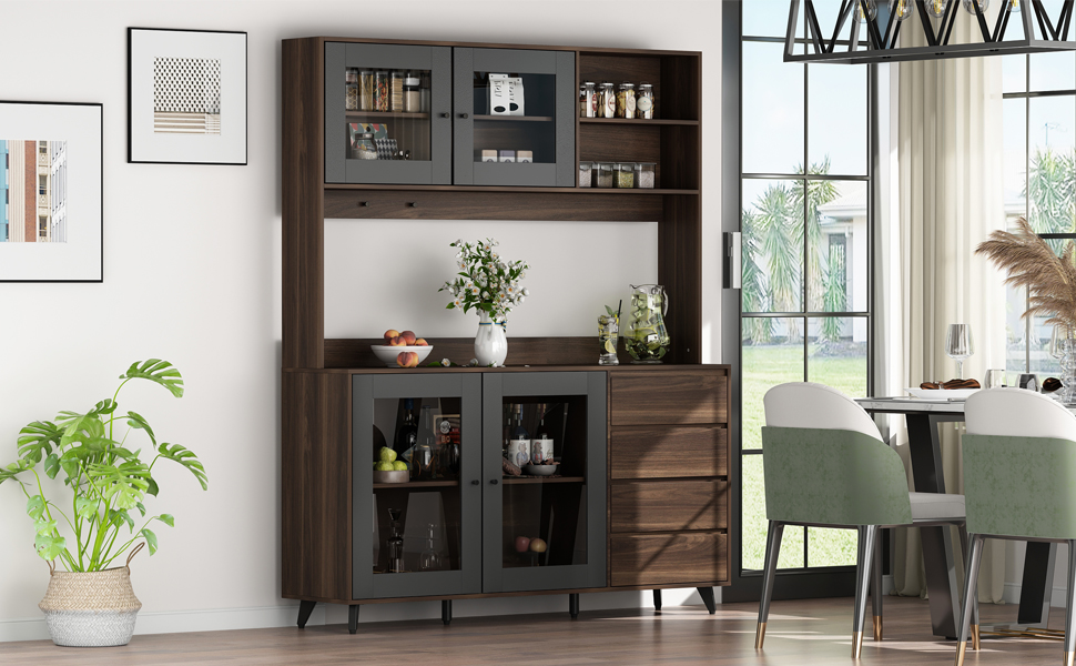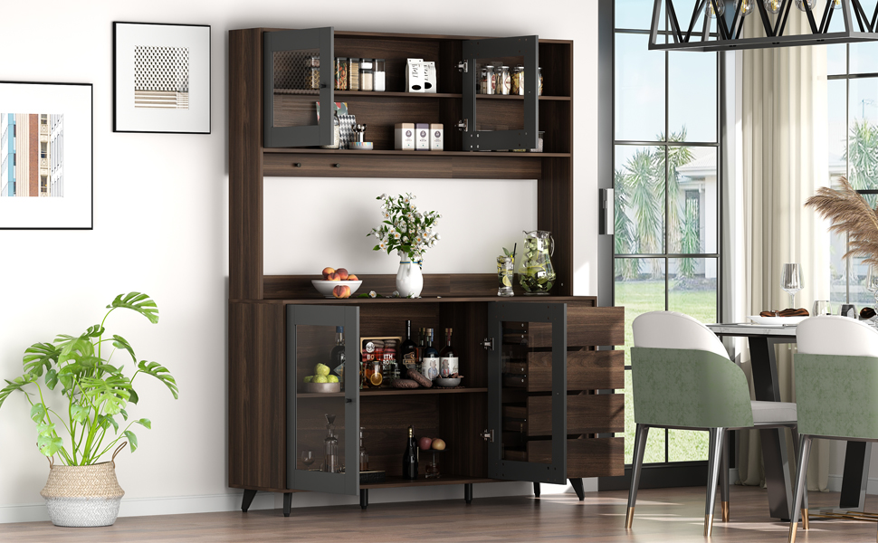 ECACAD dark brown kitchen pantry cabinet with glass doors and hutch is perfectly meet your needs of large storage capacity and exquisite appearance! It suits for many occasions, like home kitchen, dining room, hallway, living room, office, break room, restaurant and so on. This sideboard buffet with definitely update your room decor.