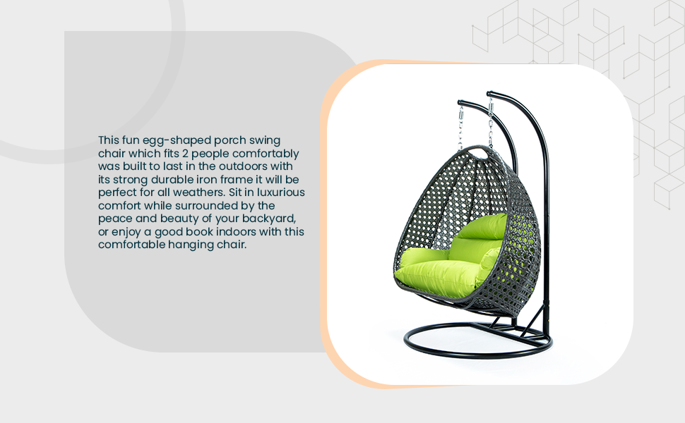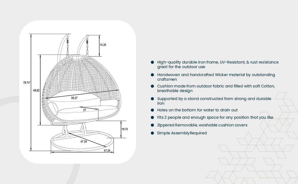Brand LeisureMod Color Light Green Material Wicker, Iron, Polyester Product Dimensions 27"D x 57"W x 78"H Item Weight 86 Pounds Frame Material Iron Maximum Weight Recommendation 529 Pounds Maximum number of compatible seats 2 Finish Type Charcoal Assembly Required Yes Item Weight 86 pounds Product Dimensions 27 x 57 x 0.99 inches Assembled Height 78 inches Assembled Width 57 inches Assembled Length 27 inches What's in the box