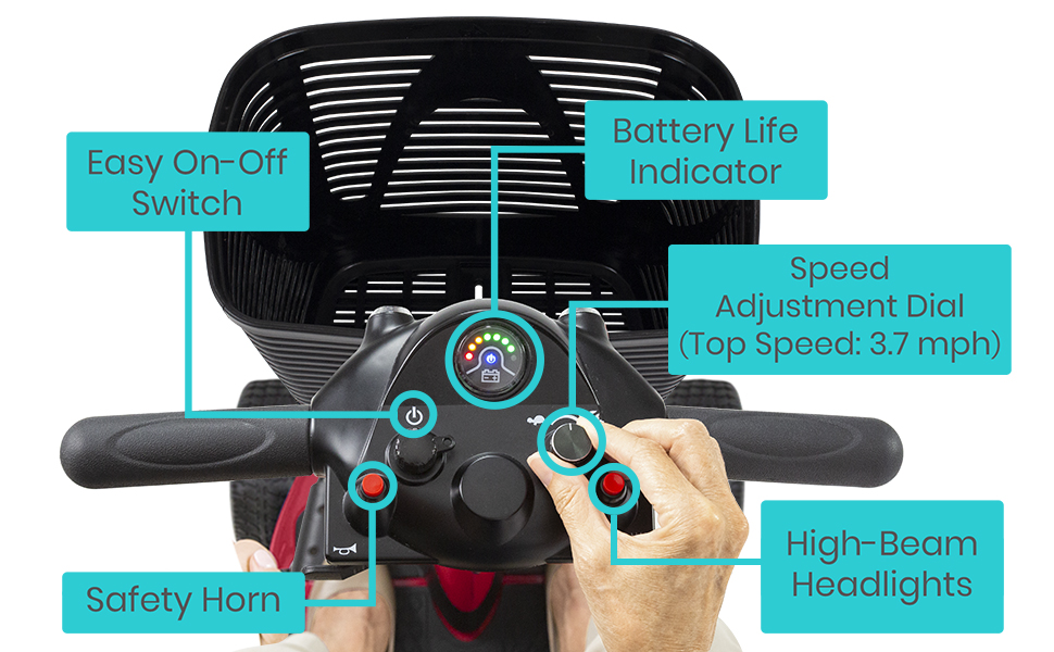 COMFORTABLE SEATING: Comfortably padded, the wide, 15.75” seat and backrest provide gentle cushioning and support. The swivel seat rotates, allowing you to more easily step off the scooter without aggravating back pain. The height-adjustable seat can easily be customized with the push of a lever, for a more comfortable fit. The scooter is also surrounded by two padded armrests that adjust and flip upward—for greater convenience when exiting or boarding.