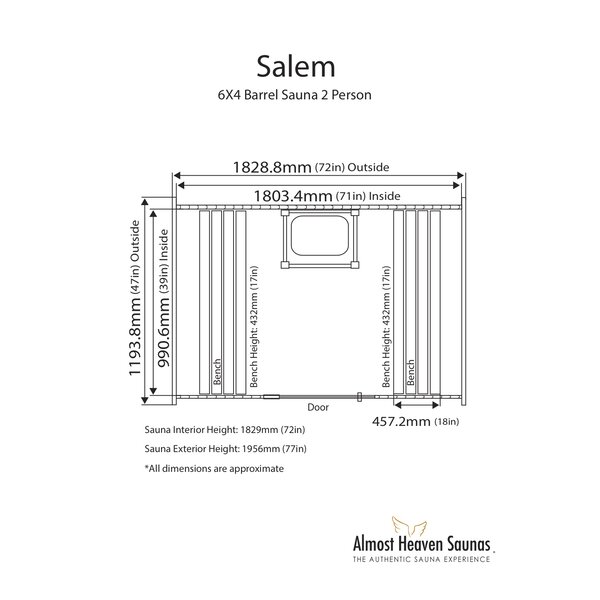 The Salem sauna is designed for those with a long to-do list and an eye for efficiency. Built to accommodate two people, this 6’x4’ traditional sauna will be at home in any backyard or home gym. Its compact design brings the sauna experience to your door without compromising space. Paired with a Harvia 4.5kW electric heater properly installed, the heater included in your sauna kit should consistently achieve temperatures of 175-185F in 45-60 minutes, turn the dial to delay the start time up to eight hours, knock off your to-do list, and relax in the rewarding heat: the choice is yours!