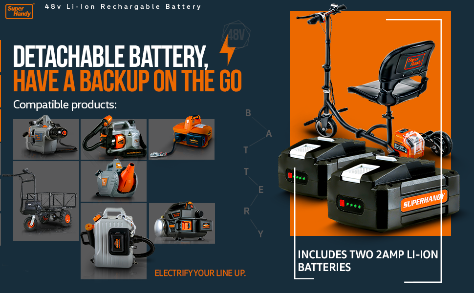 SWAP & GO BATTERY POWER - The scooter includes 2 SuperHandy 48v Li-ion Batteries giving you over 6 miles of range w/ each battery. When one battery runs out of juice, easily swap in a newly charged one and go.
