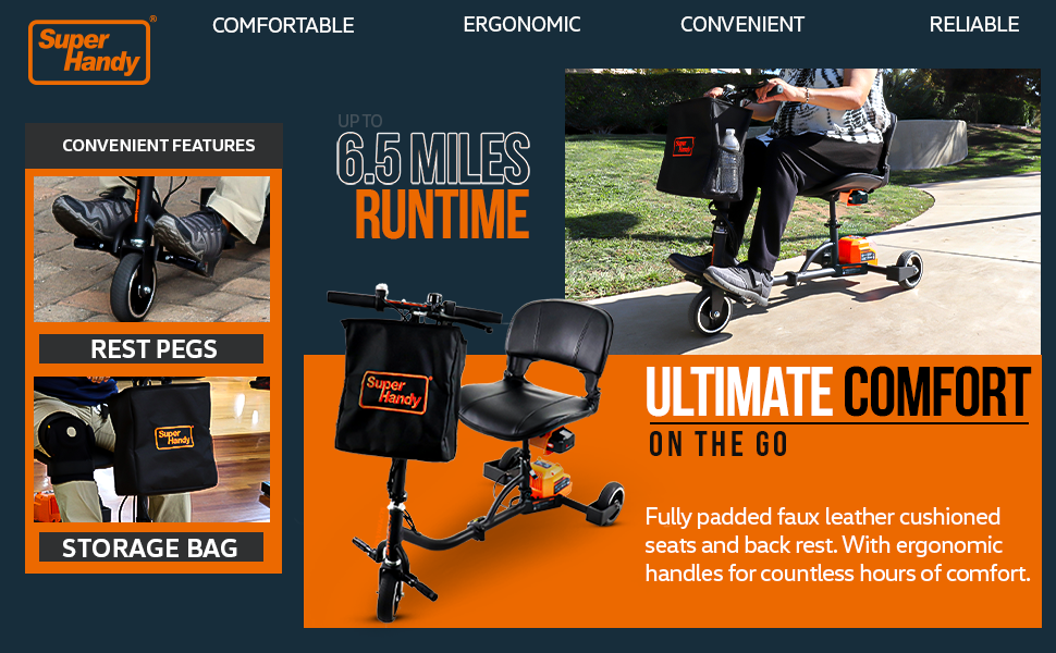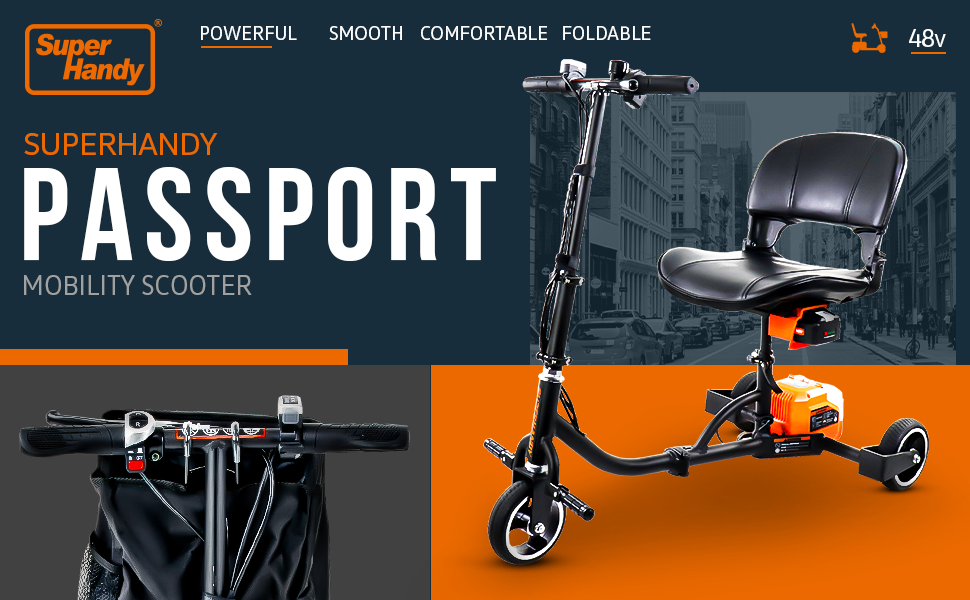 The SuperHandy "Passport" delivers an unparalleled experience in mobility, portability, and comfort. Our replaceable battery powered system is airline friendly, making air travel hassle free. The lightweight and compact design provides true portability and convenience, with the heaviest piece weighing only 26lbs when broken down for storage (Total Weight 35lbs). The "Passport" is one the lightest mobility scooters on the market.