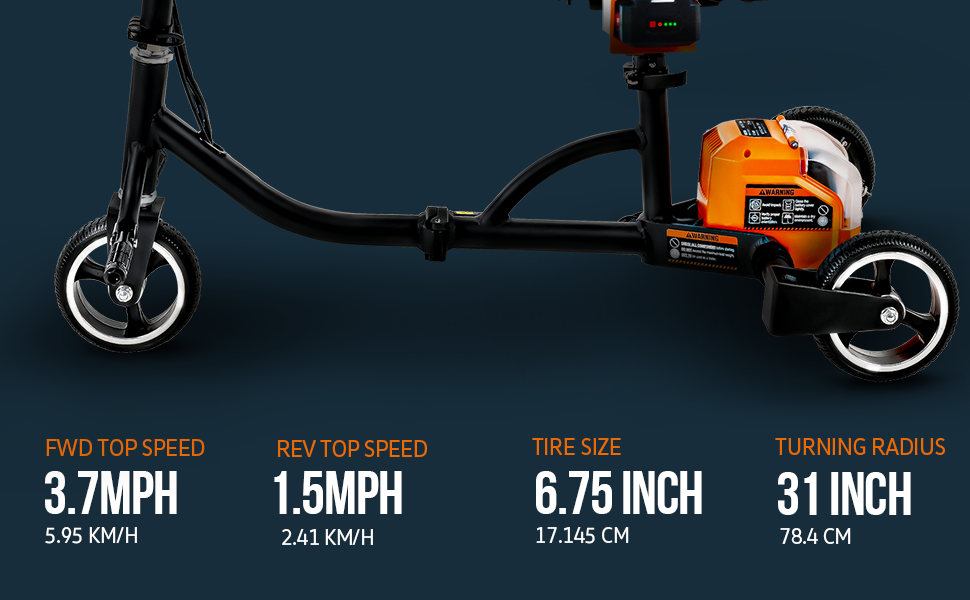 PORTABLE DESIGN - Our easy to transport and Collapsible Design can be quickly disassembled into 5 lightweight pieces that easily fit in the trunk of an average sized sedan; Equipped with a Detachable 48V Battery (BL481-SH) that can easily swap out for a backup in seconds; Our three wheel design provides easy maneuverability in tight spaces with a sharp turning radius when navigating over any smooth surface with comfort and ease with our flat-free solid non-marking rubber tires.