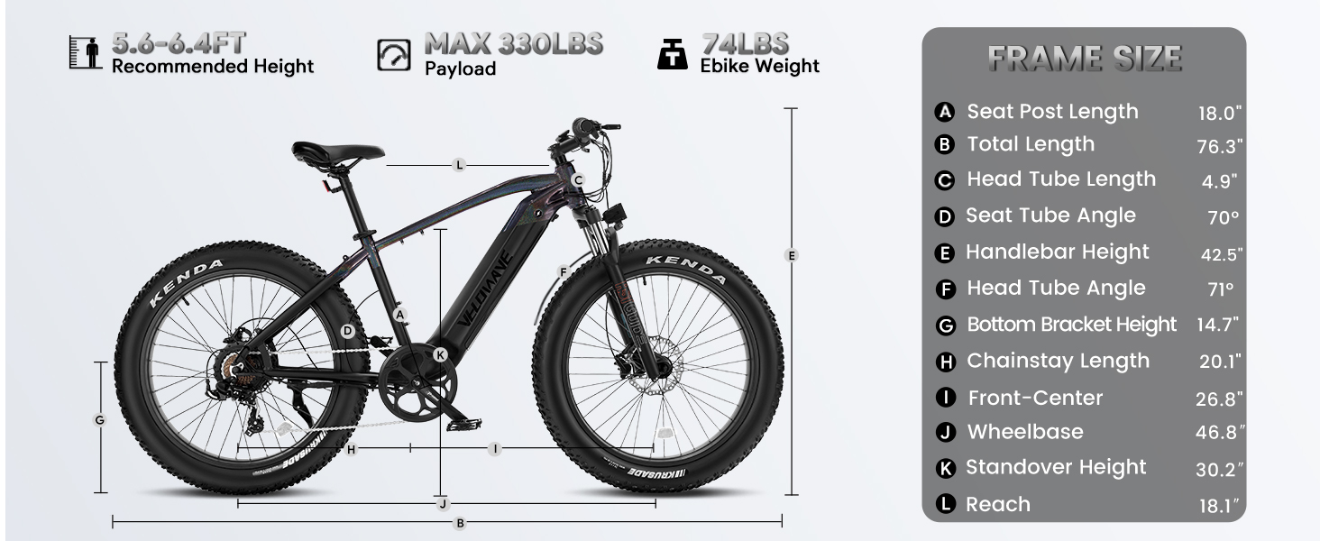 A: The recommended rider height is 5'6" ~ 6'4", payload 330 lbs at maximum.